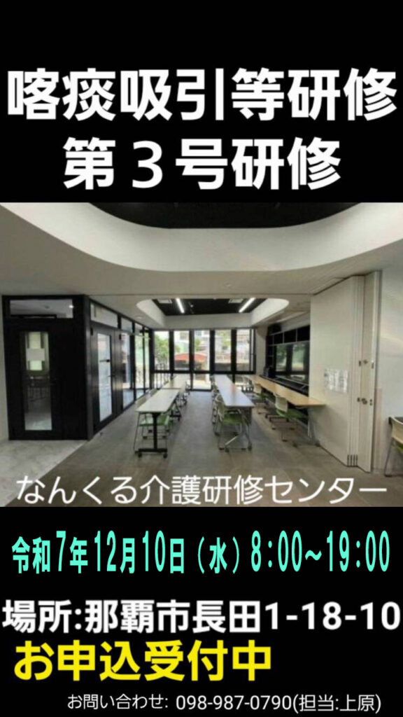 ※喀痰吸引研修のご案内※ 2025年11月14日 投稿者: nankuru-group 🪷喀痰吸引研修のご案内🪷 介護職員による喀痰吸引等研修 第3号研修 日程: 令和7年12月10日(水) 8:00~19:00 場所: 那覇市長田1-18-10 (なんくる介護研修センター) 現在お申し込み受付中です。 お問い合わせは… 📞098-987-0790 (担当:上原)までどうぞ(❁´◡`❁) お申込書はこちら↓ 喀痰吸引等研修 令和7年12月10日 前の記事求人案内(11月13日現在)